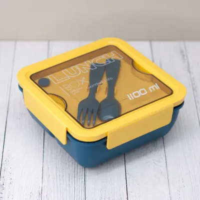 Ланч-бокс "Square" 1,1л со столовыми приборами, 17х7х7см, цв.синий с желтым