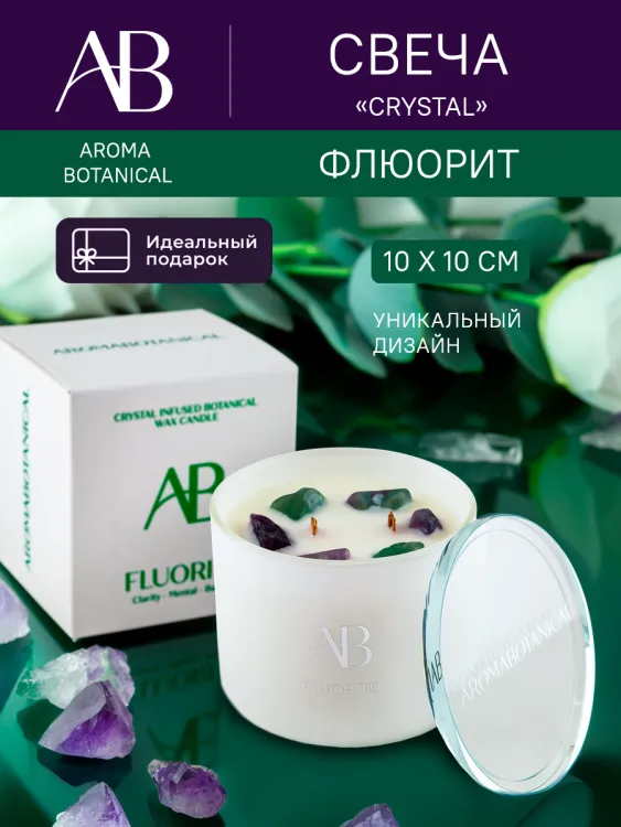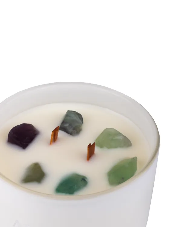 Каждая свеча имеет два деревянных фитиля, которые создают успокаивающий эффект потрескивания. Добавление камней флюорита делает ее не только предметом роскоши, но и поглощает негативную энергию.
