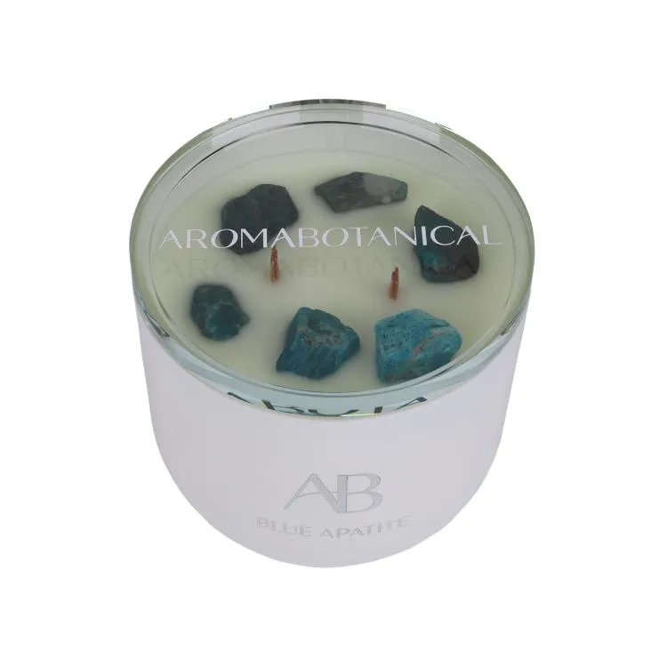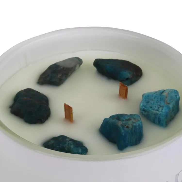 Свеча дополнена камнями голубого апатита, которые стимулируют интеллект, открывают разум и способствуют внутренней ясности. Два деревянных фитиля с эффектом потрескивания придают особый шарм, напоминая уютный каминный огонь.