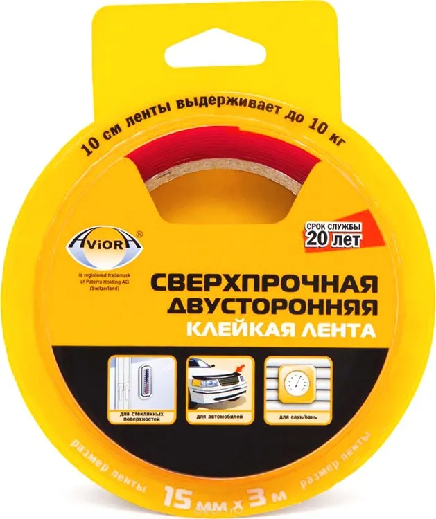 "AVIORA" Лента клейкая, двусторонняя, сверхпрочная 1,5смх3м, цв.красный