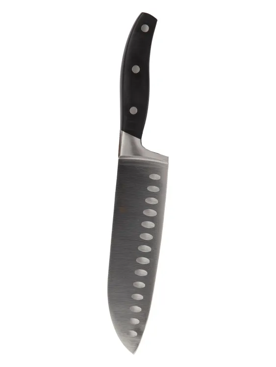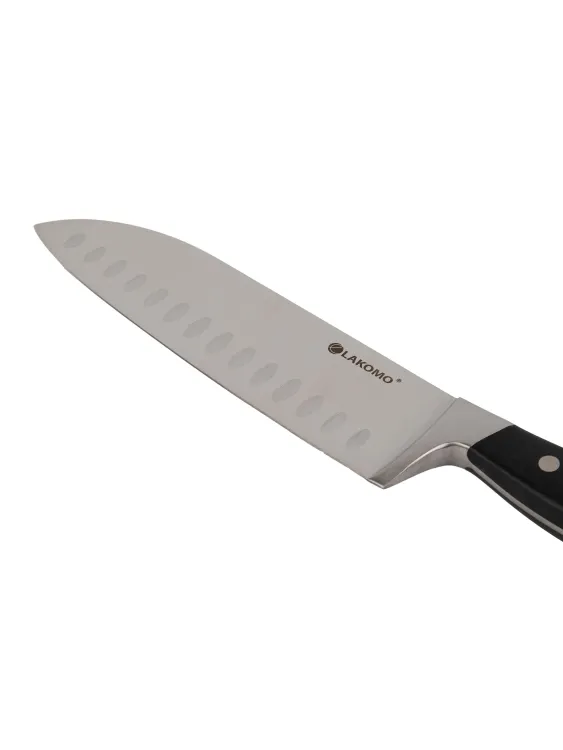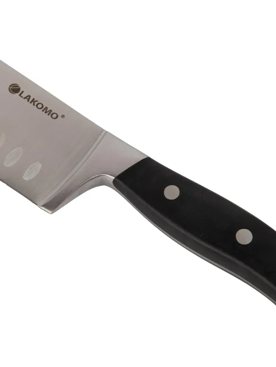 Эргономичная ручка из пластика гарантирует комфортное и уверенное использование, в то время как надежное крепление лезвия и рукояти предотвращает их ослабление и повышает безопасность при работе. Сантоку отлично подходит не только для тонкой нарезки кубиками или соломкой, но и для измельчения различных ингредиентов, чтобы каждое блюдо было приготовлено на высоком уровне.