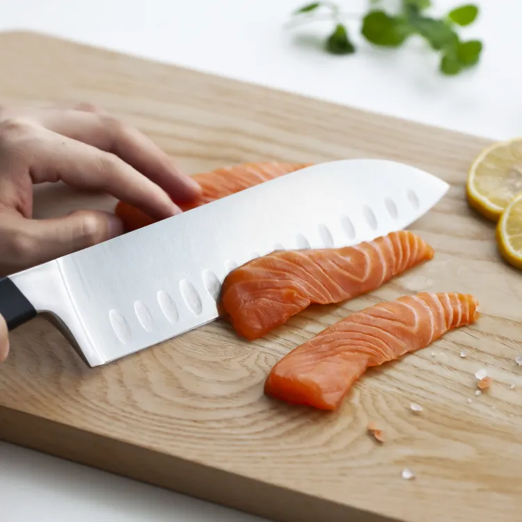 Высококлассный нож сантоку — мастер многофункциональной нарезки, который станет незаменимым помощником на любой кухне. Это идеальный инструмент для рубки мяса любого вида благодаря лезвию из высококачественной нержавеющей стали, обеспечивающему исключительную прочность и долговечность.