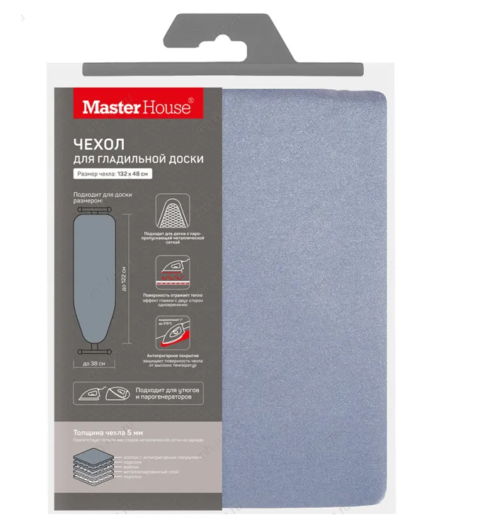 5-ти слойный чехол с антипригарным покрытием. Поверхность чехла защищена от высоких температур (до 210℃). Внутренний металлизированный слой отражает тепло и пар, что ускоряет и облегчает глажение. Подходит для использования утюга и парогенератора. Шнурок с кнопкой-стопором надежно удерживают чехол на доске.