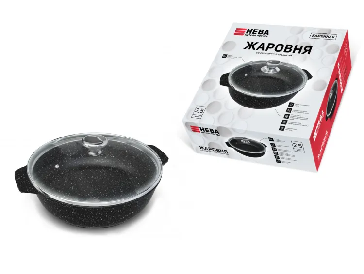 "Каменная" Чёрный гранит" Жаровня 24см, h 7,5см 2,5л со стекл. крышкой