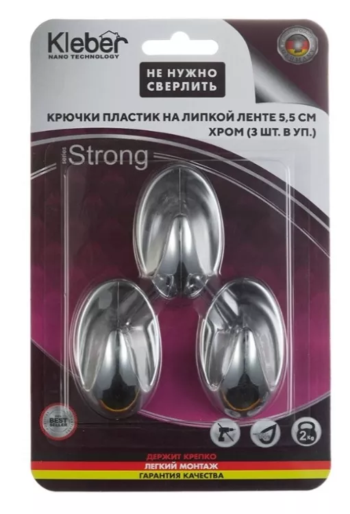"Kleber" Набор крючков на липкой ленте 3шт, 5,5см, хром, пластик