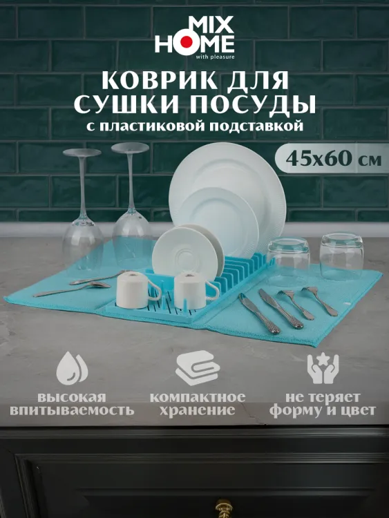 Коврик для сушки посуды с подставкой 45х60см, цв.голубой