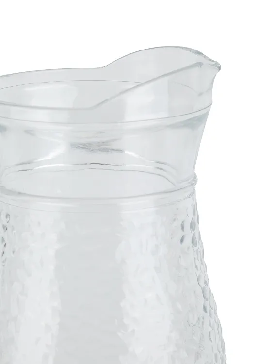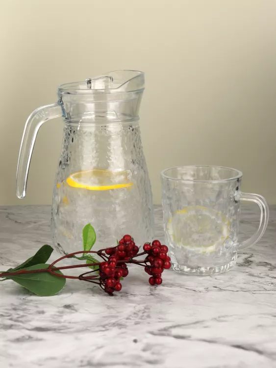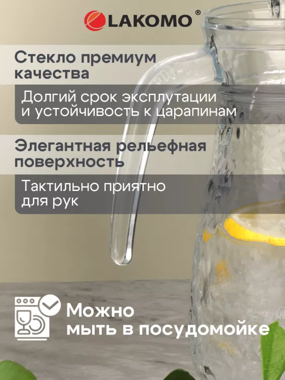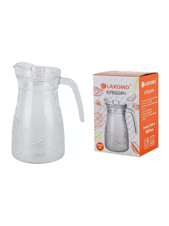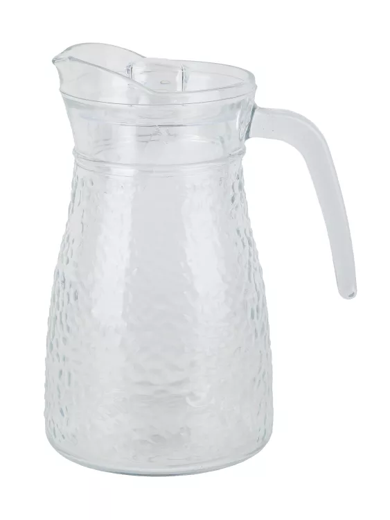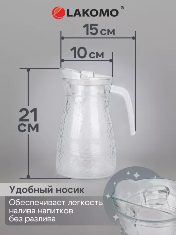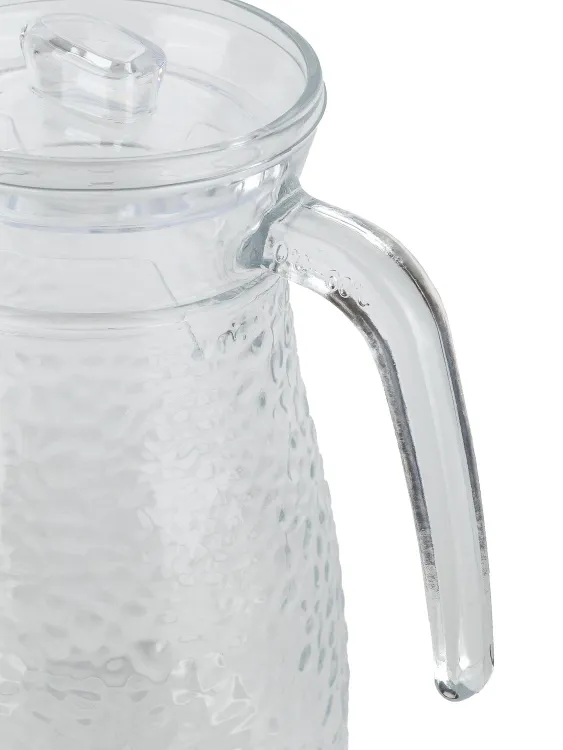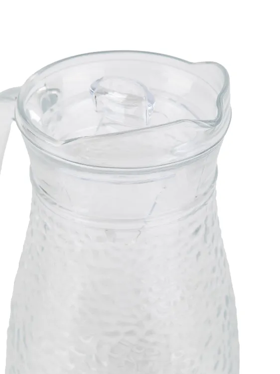 Особенность кувшина заключается в его рельефном дизайне, который создает интересную игру света, добавляя декоративный элемент к вашей сервировке. Пластиковая крышка защищает напитки от попадания пыли и насекомых. Эргономичная ручка обеспечивает комфортное использование, позволяя легко и уверенно наливать напитки.