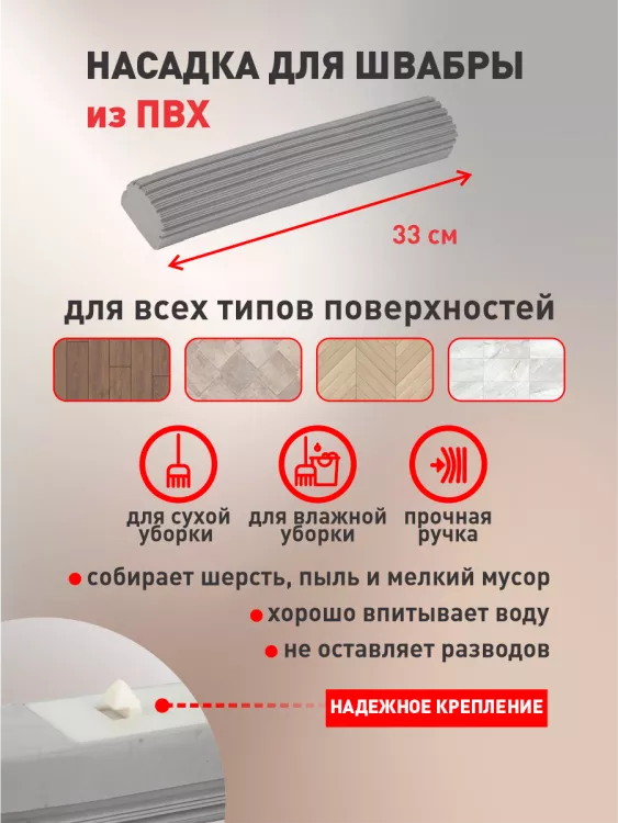 Насадка для швабры из ПВХ плотного материала размером 33x7 см станет незаменимым помощником в вашем арсенале средств для уборки дома. Созданная с учетом современных требований к качеству и функциональности, эта насадка идеально подходит для быстрого и эффективного сбора пыли, грязи и мелких частиц с любых напольных покрытий, будь то плитка, ламинат, линолеум или паркет. Ее универсальные размеры позволяют легко крепить на большинство стандартных швабр, что делает процесс уборки еще более удобным и продуктивным. Прочный материал обеспечивает долговечность использования, а плотная структура ПВХ гарантирует отличные эксплуатационные характеристики и высокую износостойкость. Вас порадует не только ее эффективность, но и легкость ухода: насадка легко моется под проточной водой и быстро сохнет, сохраняя свои свойства даже после множества циклов очистки. Этот аксессуар обязательно станет важным элементом вашего инвентаря для уборки, обеспечивая чистоту и порядок в каждом уголке вашего дома и сада.