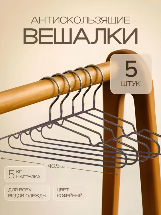 Н-р вешалок металл. с антискользящим покрытием 5шт. 40,5см, цв.кофейный