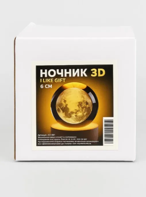 Миниатюрный 3D ночник (диаметр шара 6 см, высота основания 2 см) станет украшением любого интерьера. Он создает мягкий рассеянный свет, не раздражает глаза и способствует расслаблению перед сном. Вес: 363 гр. Размер в упаковке: 10 х 8 х 8 см.