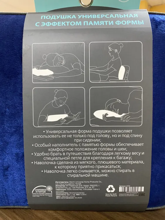 Наволочка: 100% полиэстер, плюшевая ткань с молнией. Наполнитель: пенополиуретан Плотность: 45кг / м3 Вес:0,30кг Цвет: черный, синий