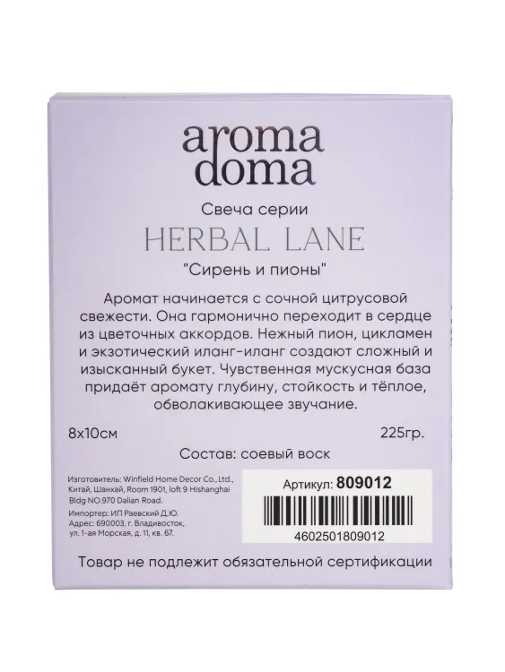 "Purity lab" Herbal lane Свеча "Сирень и пионы" 8х10см