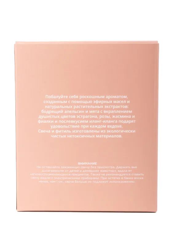 Погрузитесь в мир ароматов со свечой, созданной для дома, офиса, а также для вашей гостиной, ванной и спальни. Она наполнит каждое помещение нежным, насыщенным ароматом бодрящего апельсина и освежающей мяты, окутанным вкраплениями душистых цветов эстрагона, розы, жасмина и фиалки. Завершает композицию сладкое и соблазнительное послевкусие иланг-иланга.