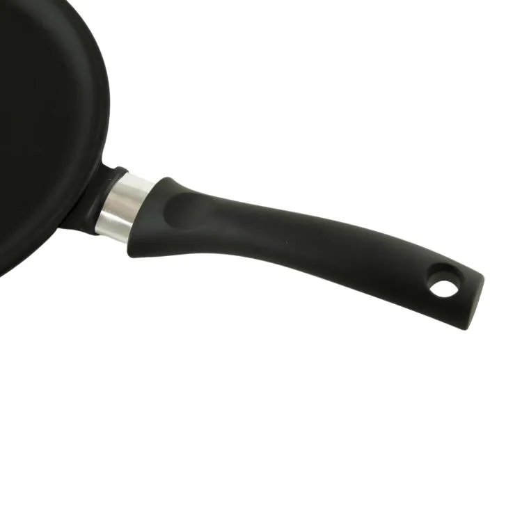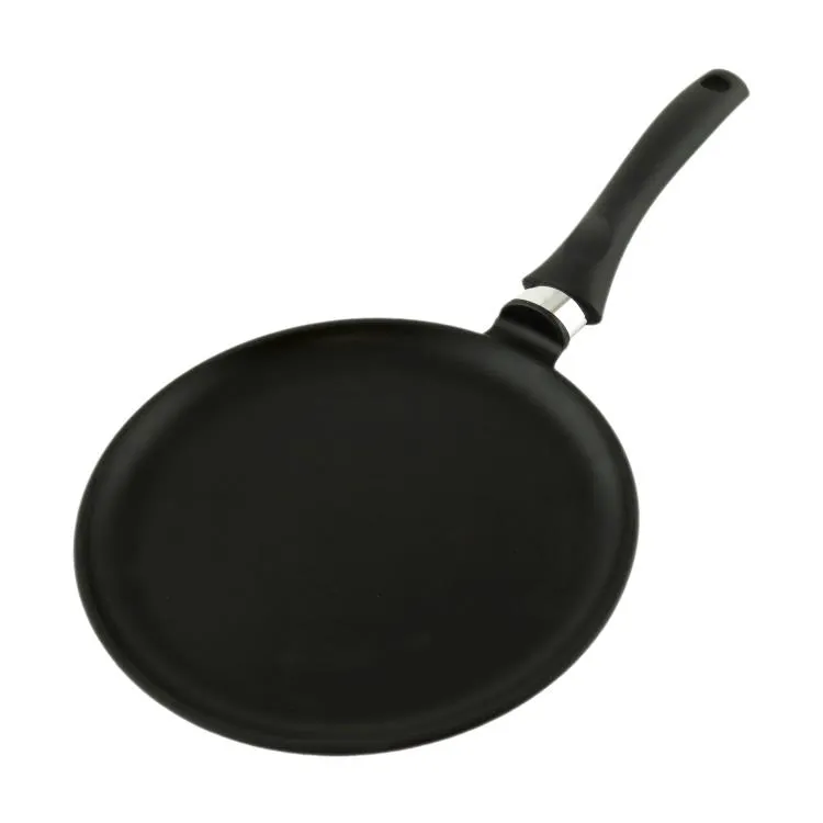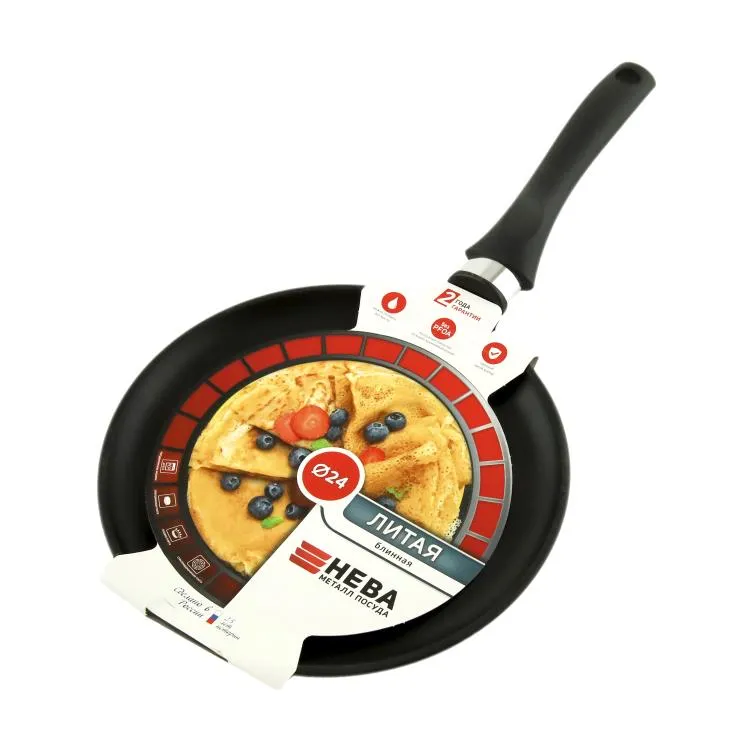 Блинная сковорода имеет низкий борт и удобную ручку, благодаря чему легко переворачивать и снимать блины даже без использования масла. Утолщенное дно обеспечивает особые термоаккумулирующие свойства: блин равномерно пропекается по всей толщине и красиво румянится с обеих сторон.
