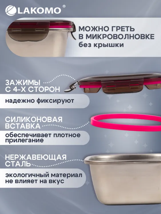 Прямоугольная форма позволяет компактно ставить их друг на друга, экономя место. Он легкий и вместительный, что делает его удобным для транспортировки. Тара идеально подходит для заготовки, маринования, а также хранения продуктов в холодильнике. Благодаря передовым технологиям изготовления стали, этот контейнер можно использовать в микроволновой печи, что значительно упрощает процесс подогрева еды и он легко моется в посудомоечной машине.