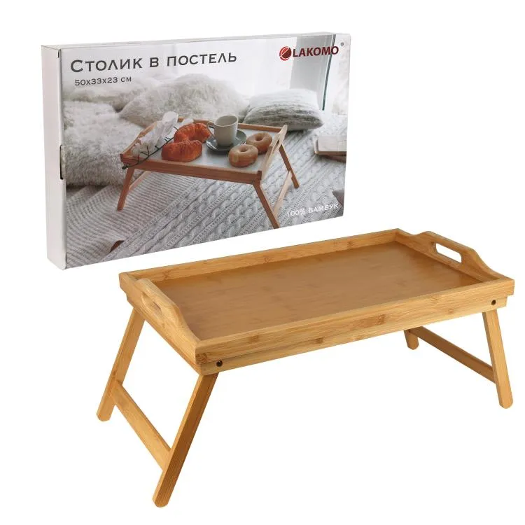 Деревянный столик из бамбука - идеальное решение для сервировки завтрака в постели. Складной и легкий, он оснащен удобными ручками для легкого переноса и устойчивыми ножками, которые обеспечивают стабильность на любой поверхности.