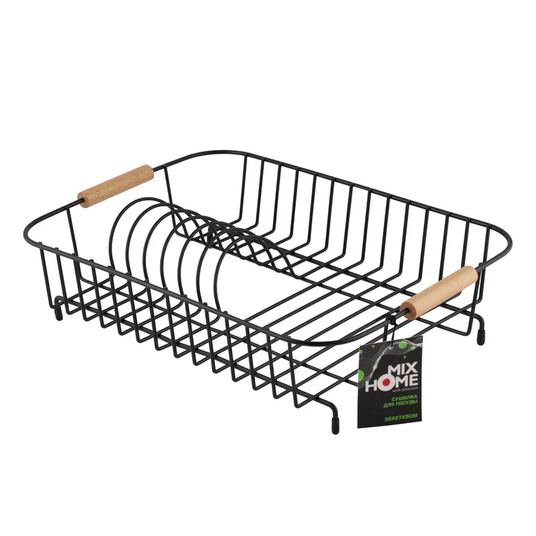Сушилка для посуды сочетает в себе функциональность и современный дизайн. Металлическая конструкция с черным покрытием и деревянными ручками придает ей стильный вид в стиле лофт, идеально вписываясь в любую кухню.