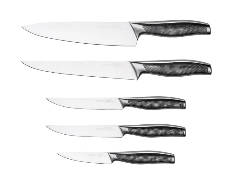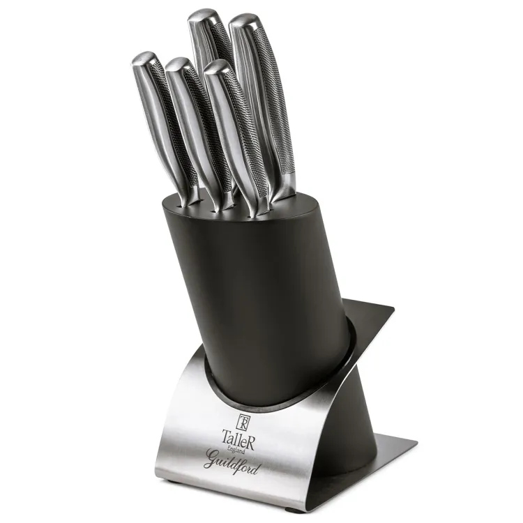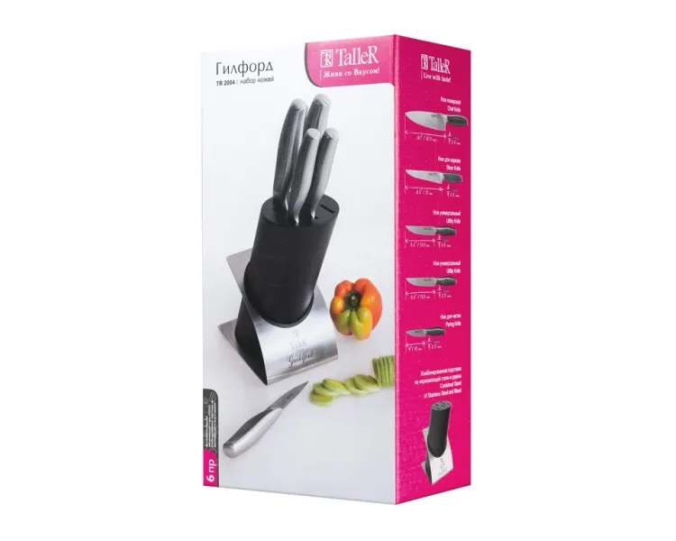 нож поварской 20,5 см - 1шт., нож для нарезки 21,0 см - 1 шт., нож универсальный 13,5 см - 2 шт, нож для чистки 10,0 см - 1 шт, подставка - 1 шт