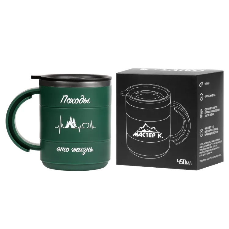 Термокружка "Походы - это жизнь" 450мл, с ручкой
