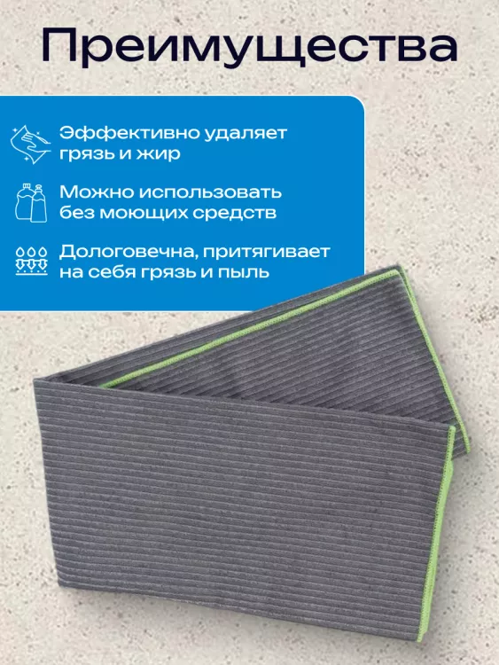Идеальны для использования в кухне, ванной, на мебели, сантехнике и в авто, тряпки обладают долговечностью и многоразовостью, что делает их практичными и экономичными. Они легко сохнут и не воняют со временем, сохраняя свои свойства и внешний вид даже после многократного использования.