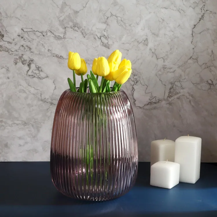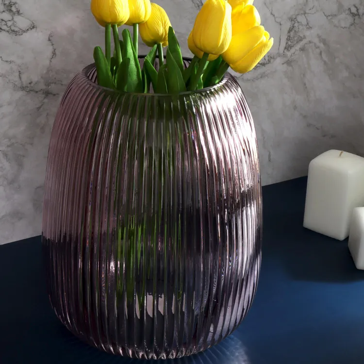 Созданная из прозрачного стекла темно-розового цвета, ваза несет в себе теплоту и уют, вместе с тем добавляя любому помещению нотку роскошной индивидуальности. Она отражает и подчёркивает красоту размещенных в ней больших букетов.