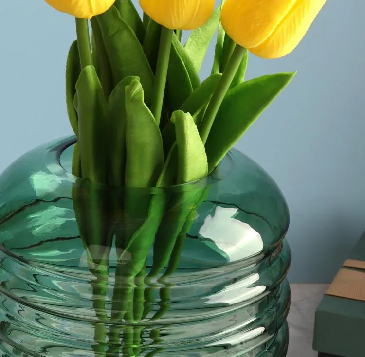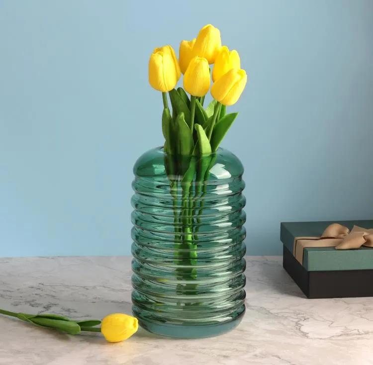 Великолепная эксклюзивная стеклянная ваза с витой текстурой отличный вариант для композиций с разнообразными букетами. Современная и оригинальная, её прозрачное зеленое стекло привносит свежесть и изящество в интерьер любого помещения — будь то уютный дом, стильный офис или кафе.