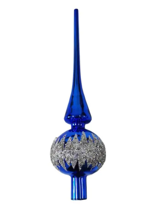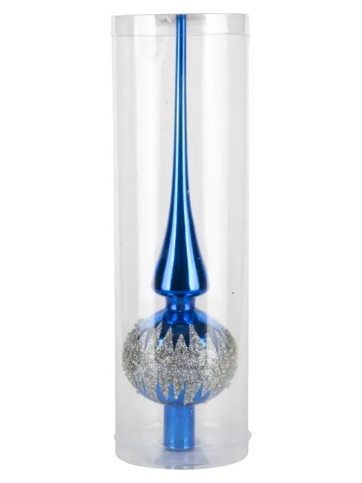 Новогодняя верхушка на елку - вечная классика, без которой не обойтись в новый год. Яркие цвета будут эффектно выглядывать с верхушки елки и радовать глаз. Украшение сделано из стекла, с дополнительными элементами из глиттера, который подчеркивает оригинальность и изысканность такого украшения. Такая верхушка элегантно завершит декор новогодней ели и подчеркнет утонченность стилистического решения. Синия верхушка из стекла.